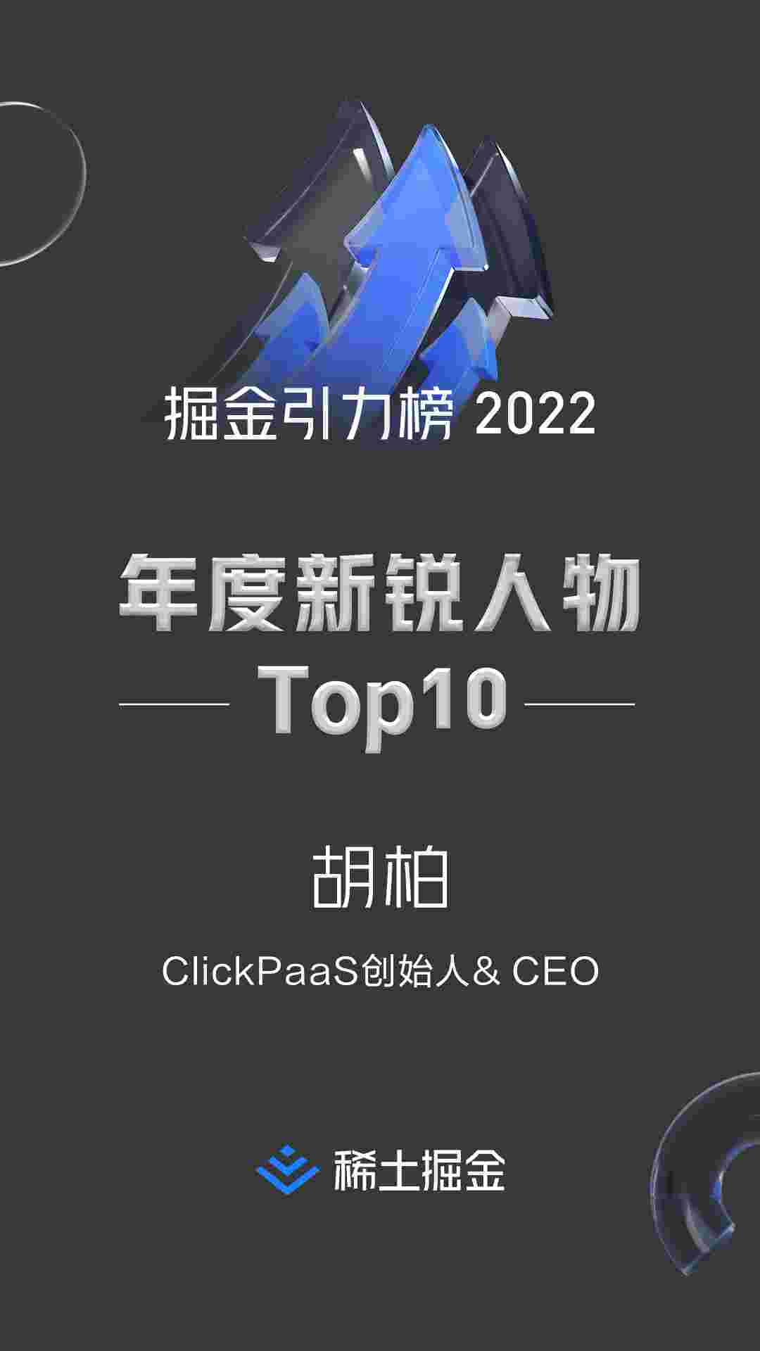 2022年1月6日,,,稀土掘金社区第一届「掘金未来大会」成功举办,,,,会上发布了“2022 稀土掘金引力榜 年度新锐人物”榜单,,,上海爱湃斯科技有限公司(简称圆梦钱包)创始人及CEO胡柏实力入选年度新锐人物TOP 10。。